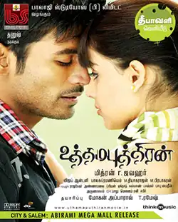 Uthamaputhiran (transl. Ideal Son) is a 2010 Indian Tamil-language romantic action comedy film directed by Mithran R. Jawahar. It is a remake of the 2008 Telugu film Ready. The film stars Dhanush and Genelia, reprising her role from the original version;[1][2] the supporting cast includes Vivek, K. Bhagyaraj, Ashish Vidyarthi and Jaya Prakash Reddy (who was also part of the original film) among others with Shriya Saran in a cameo. The film received mixed to positive reviews from critics, ended up as a commercial success among 2010 Deepavali releases along with Mynaa.