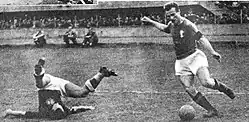 Mazzola made his debut for the national side on 5 April 1942, in a 4–0 friendly home win over Croatia.[12] He scored his first international goal on 19 April, in a 4–0 friendly home win over Spain.[7][13] Overall, Mazzola played 12 matches with the Italy national team between 1942 and 1949 and scored 4 goals, also serving as the side's captain between 1947 and 1949.[14][15]