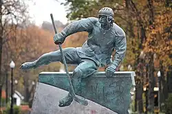 Kharlamov was posthumously inducted into the International Ice Hockey Federation (IIHF) Hall of Fame in 1998.[13] The Milestone Award is given by the IIHF Hall of Fame to teams that have made significant contributions to international hockey. In 2012, Kharlamov's 1972 Summit Series Soviet Union team was given this honor.[29] To celebrate the 100th anniversary of the IIHF in 2008, a panel of experts named Kharlamov to the Centennial All-Star Team, along with three other Soviet stars, Vladislav Tretiak, Viacheslav Fetisov and Sergei Makarov.[30] Kharlamov was inducted into the Hockey Hall of Fame in 2005. His induction was met with praise from one of the players who idolized him, Ilya Kovalchuk.[16] Kharlamov was the second Soviet trained player, after Tretiak, to be inducted into the Hall of Fame. Upon hearing the news of his father's induction, Alexander Kharlamov said "I want to say thank you for remembering my father."[9] In 2014, Kharlamov was part of the inaugural class inducted into the Russian Hockey Hall of Fame.[31]