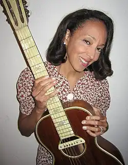 Turner's musical path to the blues started with a music book she purchased that included photographs of scenery from the American south. The imagery in the book connected her to her family's southern background in the east coast’s Piedmont region. She says, "As I was reading, I was learning about this interesting [blues] music. And once I heard it, I really loved it, and I knew that I wanted to play it." She taught herself for many years by listening to old vinyl records but, as her interest in country blues music grew, she sought out and found teachers such as Jack Baker and John Cephas.[10][11] and Woody Mann.[12] These mentors assisted Turner in mastering Piedmont style fingerpicking. As her interest in blues grew, so did her husband's curiosity. Benedict is quoted as saying, "I am an artist, and I had never played an instrument before I met Valerie. One day, I picked up a washboard in an antique shop and brought it home as joke." Benedict, who comes from Trinidad and Tobago, now plays bones, washboard, and harmonica. A senior art director / graphic designer by trade, he designs his own, elaborate musical washboards, and even has his own line of these unique percussion instruments which he calls "Darlington Washboards". Benedict taught himself to play bones and studied washboard with both Washboard Chaz from Louisiana, and Newman Taylor Baker who often played with the New York City based Ebony Hillbillies. Benedict is quoted as saying, "African Americans didn't always have money for expensive store-bought instruments and, being ingenious, found ways to make music by using common household items like spoons, washtubs, bones, jugs, and washboards. I'm just doing my part to continue this tradition. As the duo 'Piedmont Blūz'; the duo have been featured in many festivals including the Chicago Blues Festival. Internationally, they have performed in Ireland, Germany, Spain, and Israel.[10][13][14][15] Other appearances include Blues in the Gorge in Corbett, Oregon,[16] the Harvest Time Blues Festival in Monaghan, Ireland,[17] Jacob’s Ladder Festival in Sea of Galilee, Israel,[18] the Tel Aviv Blues Festival in Tel Aviv and Jerusalem, Israel,[19] plus the Brooklyn Folk Festival in Brooklyn, New York.[20]