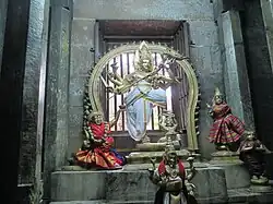 As per Hindu legend, Shiva appeared in the form of Andakasura samhara murthy to slay the demon king Andakasura.[1] Andakasura was a demon who attained powers close to immortality on account of his severe penance to Brahma, the Hindu god of creation. The boon attained had just one condition that when he lusts his mother, he would be killed. He made undue use of his powers and was troubling humans and celestial deities. During one such encounters, he started lusting toward Parvathi, the wife of Shiva and who was like his mother. Shiva appeared as Andakasura samhara murthy and slayed Andaka with his trident. Realising his mistake, he pleaded Shiva to make him a devotee of his in the next birth. It is believed that Shiva readily agreed and Andaka was born as Gana Bhringi.[2]