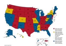 Under state laws, when a person moves to a new state with the intent to remain indefinitely, they are required to register personal vehicles in the new state.[1] The new state will then issue a plate or plates that must be attached to the vehicle.[1] One significant exception is active duty military service members; under federal law, they do not change their legal residence (domicile) upon moving to a new posting and are not obliged to obtain new vehicle registrations. Undergraduate students attending college or university in a state outside their state of legal residence are also typically exempted from transferring their registration, while graduate students are typically not exempt.[23][24][25][26][27] Louisiana does not extend this privilege to leased vehicles used by students, and requires local registration.[28] [29] A few other states, such as New York, allow, although do not require, out-of-state students to register their vehicles in state.[30]