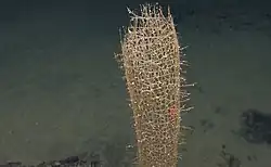 The Venus' flower basket (Euplectella aspergillum) is a species of glass sponge found in the deep waters of the Pacific Ocean, usually at depths below 500 m (1,600 ft). Like other glass sponges, they build their skeletons out of silica, which forms a unique lattice structure consisting of spicules. This body structure is of great interest in materials science as the optical and mechanical properties are in some ways superior to man-made materials.[1][2] Like other sponges, they feed by filtering sea water to capture plankton and marine snow.[3] Little is known regarding their reproductive habits, though the fluid dynamics of their body structure likely influence reproduction and it is hypothesized that they may be hermaphroditic.[4]