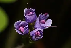 Veronica regina-nivalis is a species of flowering plant in the figwort family known by the common name snowqueen,[1] or snow queen. It is native to the Pacific coast of the United States from the Puget Sound to San Francisco Bay Area, where it grows in the forests of coastal and inland hills and mountains. It is a perennial herb growing up to about 15 centimeters tall. It has a rosette of basal leaves with hairy, lobed, heart-shaped or kidney-shaped blades borne on long petioles. The inflorescence is a small raceme of pale blue, lavender, or nearly white flowers each just under a centimeter long. The corollas are bell-shaped, the tube spreading into short lobes at the mouth, with two stamens tipped with large anthers.