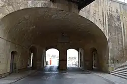 Del Monte Gate (Italian: Porta Del Monte) was built in 1569 to a design by Laparelli, and it was named after Grand Master Pierre de Monte. This gate was located between Marina Curtain and St. Barbara Bastion on the eastern side of the city, facing the Grand Harbour.[3] The area around it became a small marina, and the gate was also called the Marina Gate (Italian: Porta Marina) since it provided access to the city from the marina. The area around the gate bustled with activity, and it included a garden known as Ġnien is-Sultan, the Church of Our Lady of Liesse and the Fish Market.[4]