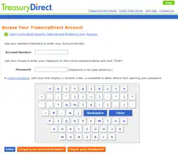 TreasuryDirect login screen, showing the virtual keyboard