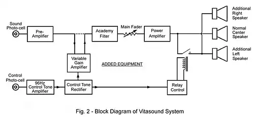 In order to achieve a wider sound source and greater dynamic range the Vitasound system employed additional left and right loudspeakers which could be switched in parallel with the normal center loudspeaker, and a variable-gain amplifier which could increase the replay volume by up to 10dB. Both the loudspeaker switching and the gain of the variable-gain amplifier were under the control of a control track recorded on the Vitasound print.