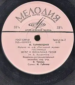 The work of the film group took place in the Elbrus region, in the Baksan Gorge, and included mandatory climbing courses for the actors. The head of the group of instructors of the film was a professional mountaineer Leonid Eliseev. The shooting, which took place in real conditions at an altitude of over 3000 meters, required from the actors qualifications at the certain level, and in some scenes and masters of sports in mountaineering.[54] According to the results of filming Vladimir Vysotsky received a certificate and badge "Mountaineer of the USSR".[55] Eliseev, who became friends with Vysotsky and told him episodes from his mountaineering practice, became an unwitting co-author of the first written for the film "Song about a friend".[56] If at the beginning of work on the film Vysotsky complained in a letter to his wife that he could not write about what he "did not know" and doubted the successful result, then, according to Govorukhin, soon the actor was imbued with the idea of mountaineering, and the songs "poured out of him like a cornucopia".[57][58] The final version of the film included five of Vysotsky's songs; two of them: "Mountain Climber" and "The pure ice on the Earth, the pure..." were not approved.[59][60] As a composer, the film's creators invited the then little-known Sofia Gubaidullina. Her music for the film and orchestrations to Vysotsky's songs were accepted by the Hudsovet, who nevertheless had complaints about the picture itself: the commission did not like the ending, the lack of a pronounced dramaturgy. Due to the lack of time for reshoots, the film appeared on the screens without changes.[61] In June 1967, the film "Vertical" was released in wide distribution. Most of the viewers saw Vysotsky on the screen for the first time, got acquainted with his new works, discovered that he was not a representative of the blatant world, singing about "little criminal", which sounded from tape recorders all over the country, but a dramatic actor and author of songs of various themes.[16][62][63] The film was a big box office success. It was seen by 32.8 million viewers. "Vertical" noticed and critics, whose opinion was almost unanimous: "The film is weak, but the songs are good". Vysotsky's acting was not emphasized in the reviews, but the lyrics of the songs were printed in many publications.[64][65]