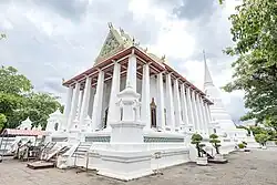 In the south side is the grand sanctuary of temple, which is called "Wihan Sila Khao". The King Mongkut ordered to bring another principal Buddha statue named "Phra Sila Khao" to place here in 1858. Nearby is also the site of the chapel, which is Thai-Chinese art as well, with "Phra Buddha Patima Chaiwat" or "Phra Chai Lang Chang" placed inside. On the back of the chapel, there is the white pagoda stand out, this is the Langka style pagoda that height is 45 m (147.64 ft) and putting inside with the Buddha relics. [2][1]