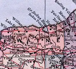 The Erie Canal transits the southern edge of the county. The villages of Clyde, Lyons, Newark, Palmyra and Macedon all became homes to canal locks when the Albany to Rochester section of the canal opened on September 10, 1823. On that day these communities became part of a direct water-link between the eastern seaboard metropolises of New York City and Baltimore and America's expanding western frontier.