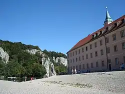 By around 45 AD the Weltenburg area was the starting point of the Via iuxta Danuvium[1] – the Roman military and border road which followed the south bank of the Danube upstream to Brigobannis, the limes fort near Hüfingen. For a long time this road was the most important east–west route north of the Alps. At Mertingen (Sumuntorium) this route met the Via Claudia Augusta from northern Italy. There was already a settlement above the monastery on the Frauenberg in prehistoric times. Archaeological finds and excavations suggest that a Roman military station was constructed there.