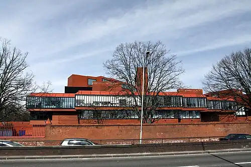 In the 1970s, the college was built on 14 acres (5.7 ha) former playing fields of St Paul's School, despite campaigns opposing the development.[5] The College was designed by the Greater London Council Architects' Department, under the supervision of Bob Giles, the project architect, in a Brutalist style inspired by Alvar Aalto's Säynätsalo Town Hall.[6]