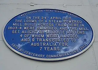 On Friday 28 April, a large crowd of weavers and mechanics gathered in Westhoughton with the intention of destroying the power looms in Rowe and Dunscough's Mill. The Scots Greys, deployed in Bolton by the government to quell unrest, were sent for but all was quiet when the contingent arrived and they returned to their quarters. Soon after they left, the factory and its contents were set alight and when the military returned the premises were destroyed and the culprits had disappeared. Some rioters gathered in the village in the evening demanding food and drink or money and the military was recalled and the Riot Act was read. Information about the ringleaders was collected and 24 men were arrested and sent for trial at Lancaster Assizes. Some were discharged but, "for having wilfully and maliciously set on fire and burnt a Weaving Mill, Warehouse and Loom Shop in the possession of Thomas Rowe and Thomas Dunscough at Westhoughton", Job Fletcher, James Smith, Thomas Kerfoot and Abraham Charlson, were sentenced to death and hanged and nine men were transported. After the Luddite act, manufacturers avoided the township until Chadwick's Silk Mill was built in the early 1850s.[1] Westhoughton Hall was attacked at the same time.[2]