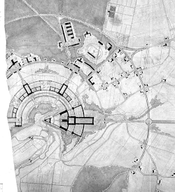 The main road of an SS village was also to be centred on the North Tower of the castle with a diameter of 1270 m. This road was to be connected with three radial roads and gates with the castle area. The residential area was to be placed in the northwest, the centre of the village in the north, and the SS-barracks in the west of the castle area; between the barracks and village a villa colony for higher SS-leaders; in the southwest farmsteads.