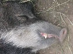 The white-lipped peccary faces numerous threats. The large amount of space they require makes them very threatened by deforestation. They are highly dependent on protected areas to keep their habitat safe from human activity. When their habitat becomes fragmented, they are at more risk of being hunted by humans, as their tendency to move in large herds makes them easy to spot. Hunters can kill many at once.[15] Even light hunting can be a threat in areas with limited resources and naturally lower population densities. In several areas of Brazil, seemingly healthy populations have become locally extinct. Their population has declined about 30% in the last 18 years, with current estimates suggesting a similar trend going into the future.[1] Unexplained disappearances have been documented in multiple areas and are suspected to be caused by disease.[13]