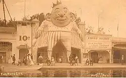 White City in 1908. The colossal figure of "King Dodo" guards the entrance to the fun house.