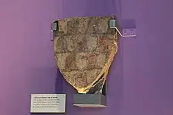 A carved stone heraldic shield painted with the coat of arms of the Ferrers family from Derby, excavated from Whitefriars[1]