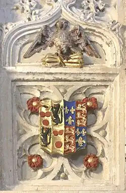 Arms of William Courtenay, 1st Earl of Devon (d.1511) above the south porch of St Peter's Church, Tiverton.[3]