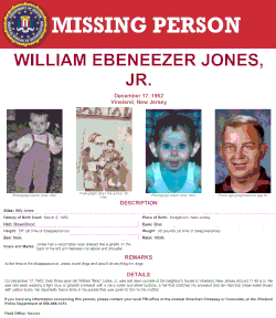 William Ebeneezer Jones Jr, also known as Billy Jones (March 5, 1959-disappeared December 17, 1962) was three years old when he was last seen outside of his neighbor's house in Vineland, New Jersey around 11:45 a.m on December 17, 1962. His case is considered one of the oldest missing children under-five-years-old cases in New Jersey.[1]