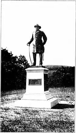 In 1905, Colvill traveled to the Soldiers Home in Minneapolis to attend a reunion of the veterans of the First Minnesota. While there, he died in his sleep on June 13.[1] He is buried in the Cannon Falls Community Cemetery in Cannon Falls, Minnesota. His original statue sits atop a shady hill where it overlooks the cemetery. In 1928, President Calvin Coolidge was present for the dedication of a statue that was placed next to his grave.