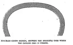 Herman Lindeman patented a construction for cycloid pianos in 1860. These roughly semi-circular squares were manufactured with the sides and interior portions of the wooden frame laminated from long, thick veneers bent and glued up into a single, continuous piece with the required shape and thickness, in order to make the pianos "lighter, smaller and circular at the back and sides."[7] The firm advertised that the cycloid was "the most elegant in shape, the most exquisite in tone, the strongest and most enduring piano manufactured in the world" and made an unsupportable claim in the late 1860s that it was "driving the unsightly square piano out of the market."[8] This patent was credited by piano historians Daniel Spillane and Alfred Dolge to Herman's younger brother Henry, who is not listed on the original or reissued United States patents, but is listed jointly with Herman in the 1865 English patent;[9] both historians also identified Henry as the oldest brother.