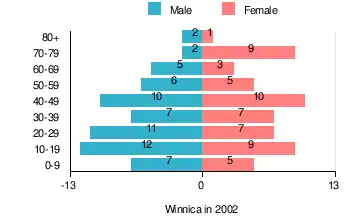 According to the 2002 Poland census, there were 118 people residing in Winnica village, of whom 52.5% were male and 47.5% were female. In the village, the population was spread out, with 26.3% under the age of 18, 36.4% from 18 to 44, 20.3% from 45 to 64, and 16.9% who were 65 years of age or older.[1]