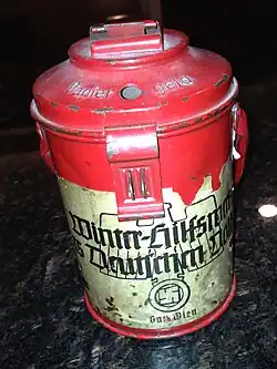 The Can Rattlers, as they became known, were relentless in their pursuit of making sure every good German citizen gave their share to the WHW. In fact, those who forgot to give had their names put in the paper to remind them of their neglect. Neighbors and even family members were encouraged to whisper the names of shirkers to their block leaders so that they could persuade them to do their duty. On one occasion, a civil servant was prosecuted for failure to donate, and his argument that it was voluntary was dismissed on the grounds it was an extreme view of liberty to neglect all duties that were not actually prescribed by law and therefore an abuse of liberty.[15] It was not unheard of for workers to lose their jobs for not donating to Winterhilfe or not giving enough. For instance, when a worker was fired for not donating to Winterhilfe, the firing was upheld by a labour court on the grounds that it was "conduct hostile to the community of the people ... to be most strongly condemned".[16]