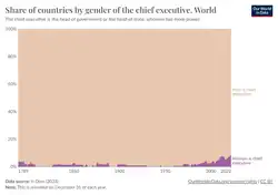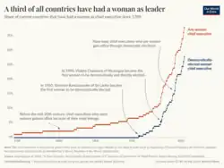 As of October 2019, the global participation rate of women in national-level parliaments was 24.5%.[4] In 2013, women accounted for 8% of all national leaders and 2% of all presidential posts. Furthermore, 75% of all female prime ministers and presidents took office in the two decades through to 2016.[5]