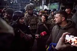 Women have played a significant role as journalists in the invasion.[108][109] Lynn Elber of the Associated Press has stated that the "presence of women reporting in Ukraine is set against a backdrop of traditional roles and expectations" but that presence has "changed the nature of war reporting. They cover the tactics of war, but give equal measure to its toll."[110] Women journalists have faced particular difficulties during the invasion. Foreign Policy said that women have made up around 23% of "total experts, protagonists, or sources" in news articles about the invasion.[111] Additional coverage and discussion about the war has been seen by female Ukrainian journalists living abroad, where they work to combat Russian propaganda and work help bring aid and awareness to the situation.[112]