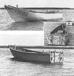 Landing Craft, Personnel (Medium) or LCP(M) was constructed of wood. The craft had a shallow draft and a solid bow so it can be grounded safely on beaches. It also operated well in rocky coastlines. For loading and unloading the craft at the bow and stern four portable ladders were used. The craft could carry 20 troops with a range of 112 miles at the top speed of 7 knots loaded. The craft had a length of 39 feet, a beam of 10 feet, and displaced 4 tons lite and 7 tons loaded. The craft had a draft of 1-foot 6 inches forward and foot 7 inches aft. The craft was Armed with one .303 cal. Lewis gun. The craft was crewed by one officer per 3 craft and 3 men. Powered was from one Scripps Ford V- 8, 65-hp. engine to a single screw. The 100 gallons of gasoline fuel was stored in two fire-resistant covered tanks, called "Linatex. Two were lost in 1943: No.14 in November 1943 and No.17 was lost off Isle of Wight on January 5, 1943[99][92]