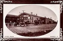 There was some heated debate about the location of the station, after initial plans for the railway line to bypass Woodville were revised to include Woodville on the route. This was interpreted by the settlers of the area to mean that the line would run through the town, to which some vociferously objected. A meeting was organised to rally opposition to the move, but called off a few weeks later when the actual location of the station was revealed.[8] The station was placed on the edge of the town to allow space for an engine shed and workshops.[9]