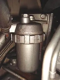 An inline fuel filter is easily accessible from the front part of the engine. The filter retains solid particles and separates water from diesel (as water is heavier than diesel, it will settle at the bottom of the filter), just before the diesel fuel enters the highly sensitive high-pressure fuel pump. The water inside diesel fuel can lead to rusting of the internals of the engine, as well as lubrication problems. The filter element is made of fluted paper with metal end caps.