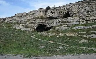 The existence of paleontological and archaeological findings point towards the use of the cave as a human and an animal habitat, alternatively.[9][11][12][13] The finds include bones of herbivore and carnivore mammals,[14] marine and freshwater molluscs,[15] microfauna as well as artifacts like potsherds, knives on flint, oldowans, choppers and hammerstones on quartzite, as well as manuports. The wide variety of prehistoric faunal specimens belong to bones of herbivore mammals such as cave bears (Ursus deningeri), horses (Equus caballus), wild boars (Sus scrofa), fallow deer (Dama dama), roe deer (Capreolus capreolus), deer (Megaloceros), cattle (Bos/Bison), antilopes (Gazella), goats (Capra), and carnivores such as wolves and dogs (Canis), foxes (Vulpes), tigers (Panthera), cats (Felis) and hyenas (Crocuta).[1] Findings of "more than 5000 fossil bones and teeth of cave and brown bears", which provide some chronological indicators, led to their extensive scientific study.[11][15][16][17][18] Another subject of such extensive study were the fossils of several species of Middle Pleistocene bats (Chiroptera), including horseshoe bats (Rhinolophus), mouse-eared bats (Myotis), long-eared bats (Plecotus) and bent-winged bats (Miniopterus).[19]