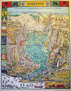 1931 visitor map featuring depictions of Yosemite's scenery, buildings, and activities, printed by the Yosemite Park and Curry Company.