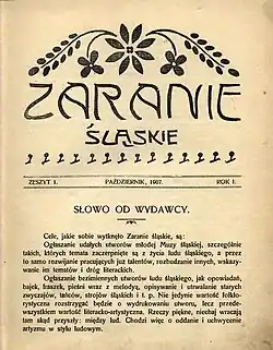 It focused on the region of Cieszyn Silesia, however, since the 1930s, the magazine gradually left this area of interest and focused more on Upper Silesia.[1] Zaranie Śląskie published historical and folkloristic articles, literary works, folk songs, and similar cultural works of interest. Many well-known regional writers and activists contributed to the magazine, e.g. Ludwik Brożek, Emanuel Grim, Andrzej Hławiczka, Paweł Kubisz, Jan Łysek, Antoni Macoszek, Julian Przyboś, Oskar Zawisza and others.