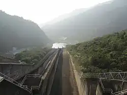 The concrete spillway was constructed to the north (right bank) of the dam and consists of a multi-level open channel controlled by three radial gates. Due to a large volume of unstable sandstone, clay and shale that comprised the slope where the spillway was to be built, about 6,040,000 cubic metres (213,000,000 cu ft) of material had to be removed before concrete placement could begin. Construction of the spillway was carried out simultaneously with the main dam. The spillway can discharge up to 9,470 cubic metres per second (334,000 cu ft/s) when all the gates are open.[12] The dam is also equipped with two sluice gates for de-silting operations, and two flood outlet tunnels with 160 cubic metres per second (5,700 cu ft/s) capacity.