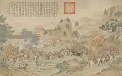 The Qianlong Emperor took great care to document his successes in the war.[10] He ordered the painting of the 100 most meritorious servitors of the Qing (紫光阁功臣像: brave Qing officers, generals, and also a few Torghut and Dörbed allies, as well as vanquished Choros Oirats, or Muslim Uyghur allies such as Khojis or Amin Khoja), as well as paintings of the battle scenes whenever the Qing were successful. The faces are in Western realistic style, while the bodies were probably drawn by Chinese court artists.[10] According to contemporary Jesuit painter Jean-Denis Attiret: "During the whole duration of this war against the Eleuths and other Tartars, their allies, whenever the imperials troops gained some victories, the painters were ordered to paint them. Those of the most important officers who had played the decisive roles in the events were favoured to appear in the paintings according to what really had happened".[10] These paintings were all made by foreign artists, specifically the Jesuits under Giuseppe Castiglione, and Chinese court-painters under their direction.[10]